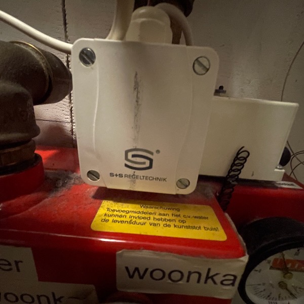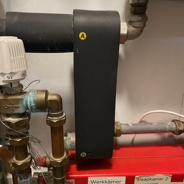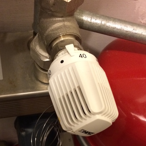 ![]() | Warmtebegrenzer, thermostaatkraan die zorgt dat de temperatuur van de verwarming niet boven de 36 graden kan komen. Niet aan draaien | |