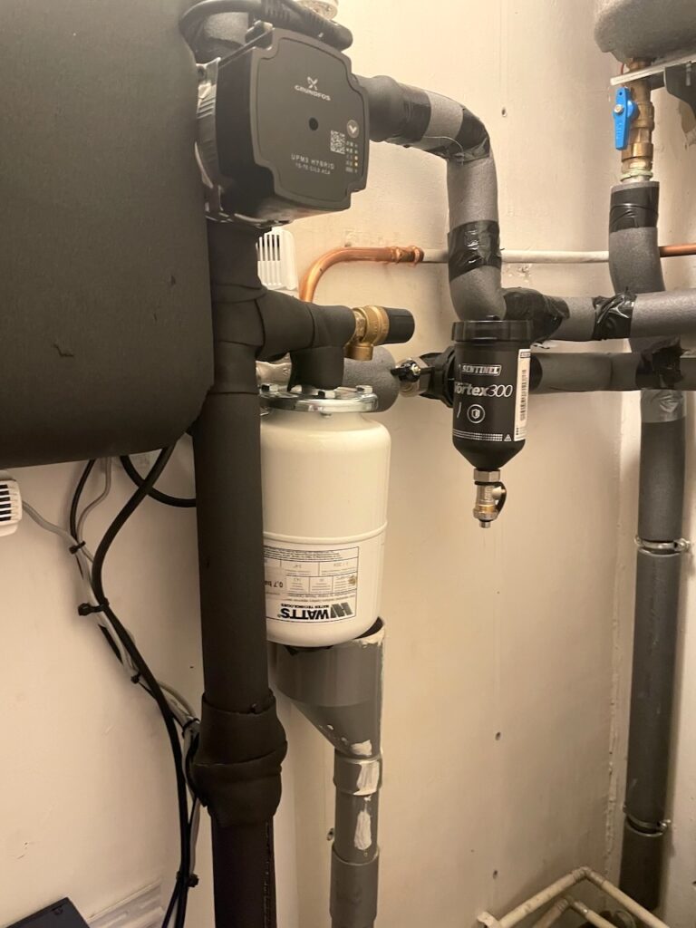 Pomp (oud, boven), expansievat (wit, nieuw) en filter (nieuw). Rechtsboven nog een oude afleverset