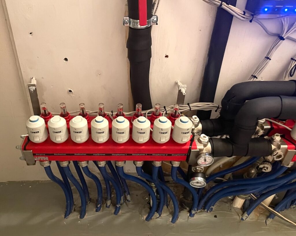 Deze pagina beschrijft onderdelen en werking van de installatie per gebouw. Er zijn verschillen doordat tussen 2009 en 2012 verschillende bedrijven de WKO-huisinstallatie hebben ontworpen en aangelegd. Alle installaties hebben leidingen naar de vloer per vertrek, een verdelerblok om het warme of koude water door deze leidingen te sturen en elektronica voor het samenspel tussen de onderdelen en thermostaten.